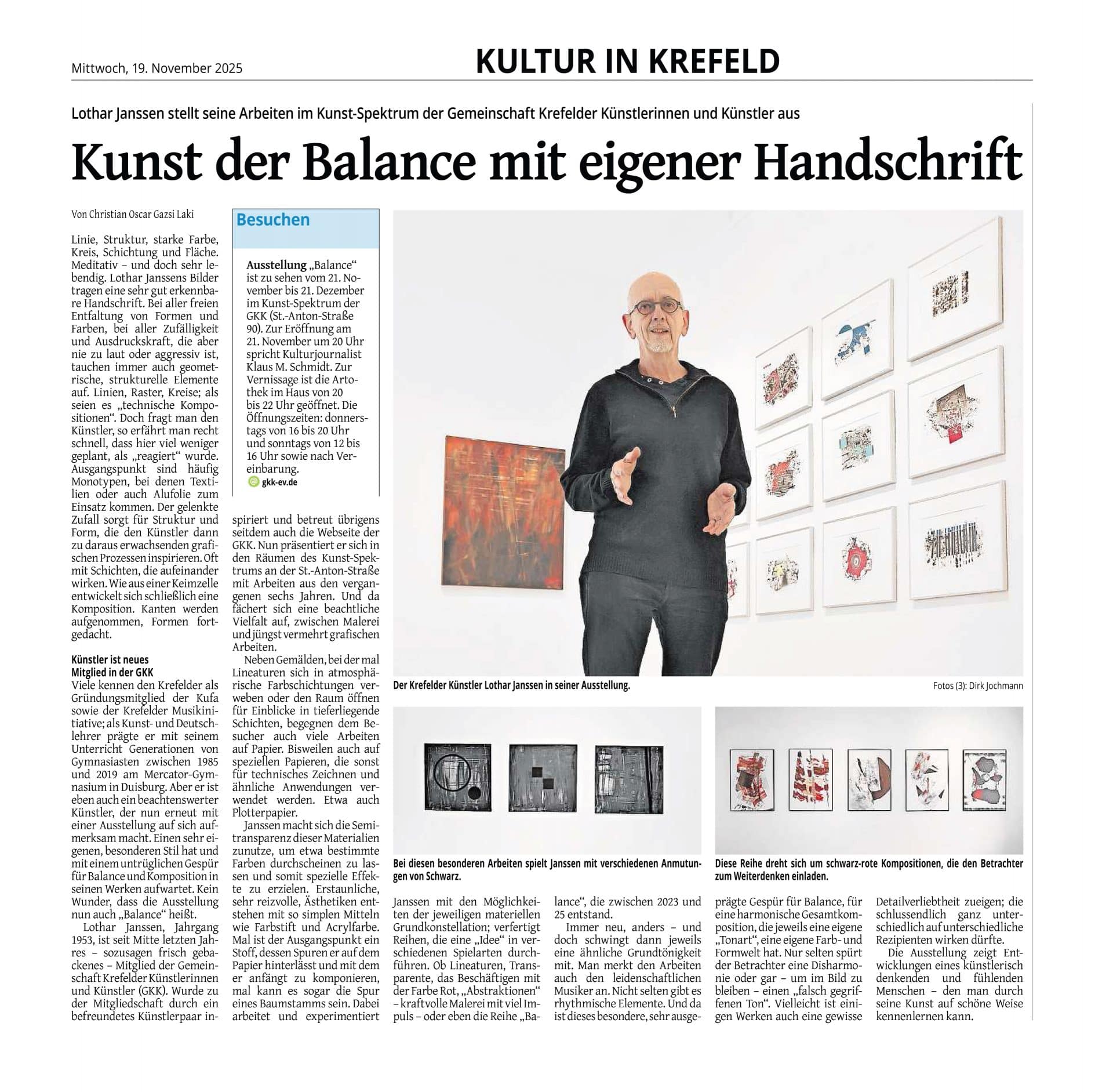 Seit Mitte letzten Jahres ist Lothar Janssen (*1953) Mitglied der Gemeinschaft Krefelder Künstlerinnen und Künstler (GKK) und dort seitdem für die Website verantwortlich. Jetzt zeigt er in einer umfangreichen Einzelausstellung seine künstlerischen Arbeiten aus den vergangenen sechs Jahren. Das Kunst-Spektrum auf der St.-Anton-Straße bietet auf zwei Etagen viel Raum, um die unterschiedlichen Werkgruppen zu präsentieren.