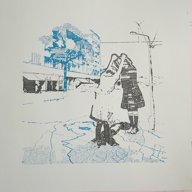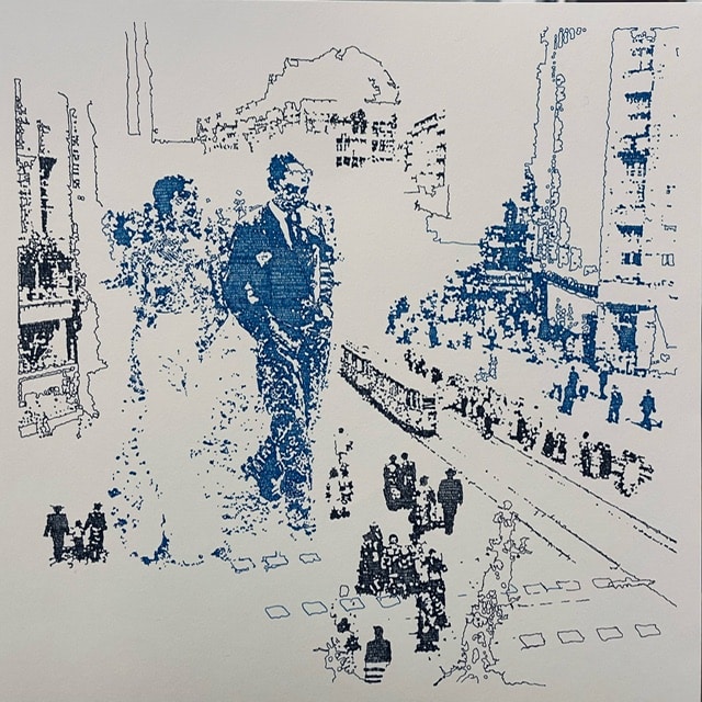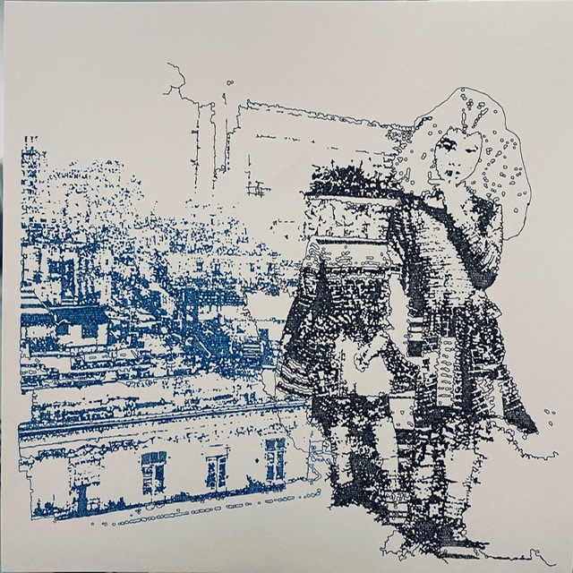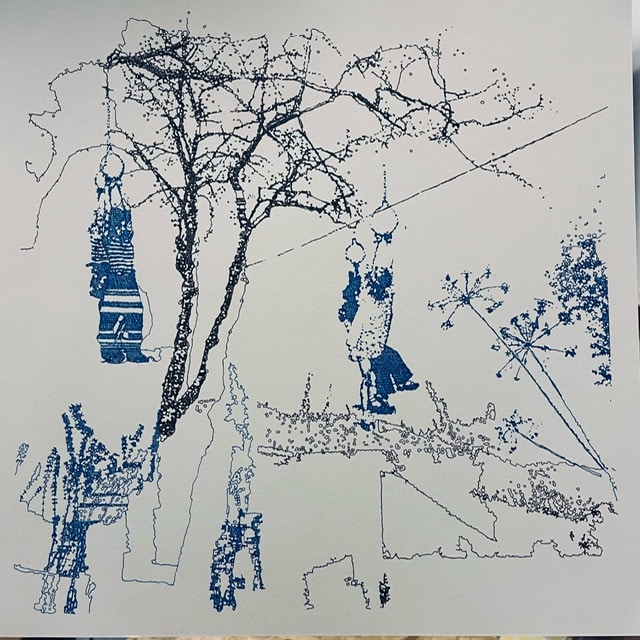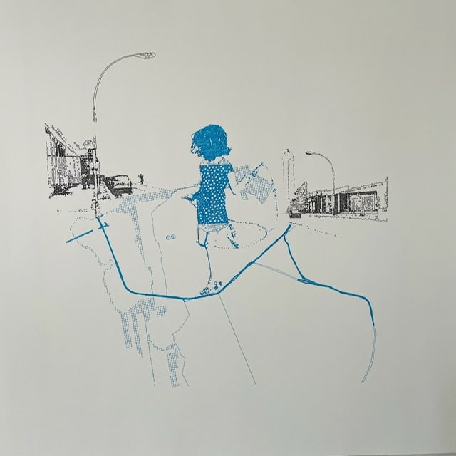 Bei den Arbeiten von Inken Horn ist die Feinheit ganz wörtlich zu nehmen. Sie zeichnet mit winzigsten Tusche-Kreiseln und -Linien collagierte Foto-Motive nach. Eine reizvolle Technik, gepaart mit nostalgischen, lyrischen Motiven. Dazu im Kontrast: Blau und Schwarz auf weißem Papier wirken die Arbeiten wie Drucke, sind aber in minutiöser Kleinarbeit entstandene „Gewebe“, die Raster für luftige und doch dokumentarisch anmutende Szenerien sind. Mal zeigen die Arbeiten Figuren in ungewöhnlichem Kontext, mal mischen sie mehrere Motive. Aber immer mit Esprit komponiert. Horn hat übrigens auch eine großformatige Arbeit für eine Wand geschaffen, aus Perlen, die ebenfalls eine Figur in einem besonderen Kontext zeigt.“