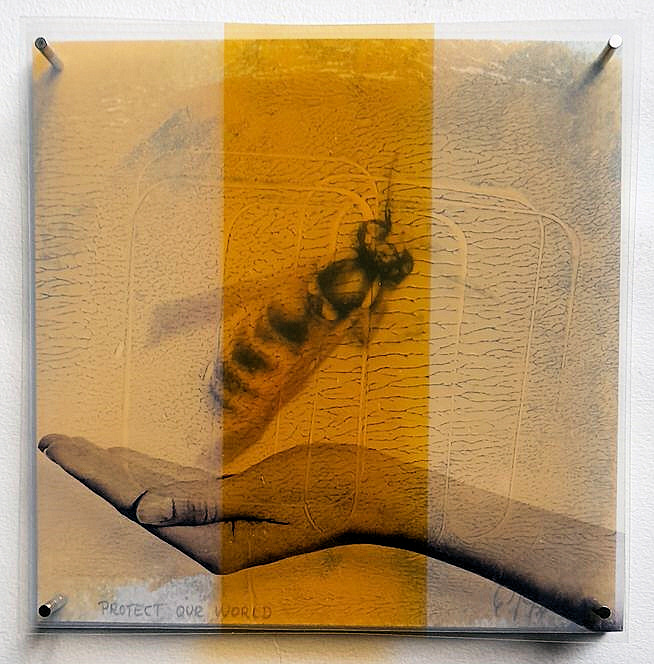 Vier – „eher leichtere Arbeiten“, wie sie selbst sagt – zeigt die Künstlerin, wobei die Leichtigkeit eher auch wörtlich zu verstehen ist. Sonst haben Behrs Objekte und Installationen mehr Gewicht, sind nicht selten transluzente, mit Wachs oder Harz gefertigte Licht oder Farbschichtungen, bisweilen basierend auf Spurensuchen durch die Fundgrube zivilisatorischer Überreste, indes stets mit einer fast meditativen Ruhe, einer Tiefe. Auch einem ästhetischen Gewicht. Die vier „leichten“ Arbeiten sind gerahmte Papierarbeiten hinter Glas, die aber „als Stellvertreter“ für ihre großen Werke dienend vergleichbares Vokabular verwenden. Wachs, schichtig, brüchig, aber immer ruhig, fast möchte man sagen unaufgeregt, mit kleinen Farbtupfern, angehauchten Störungen. Den Startschuss für diese Werkreihe bot die Ausstellung „Schein & Sein“.