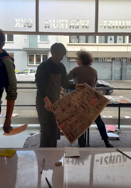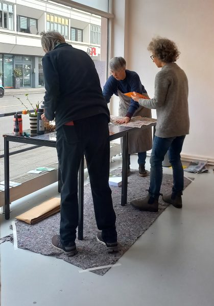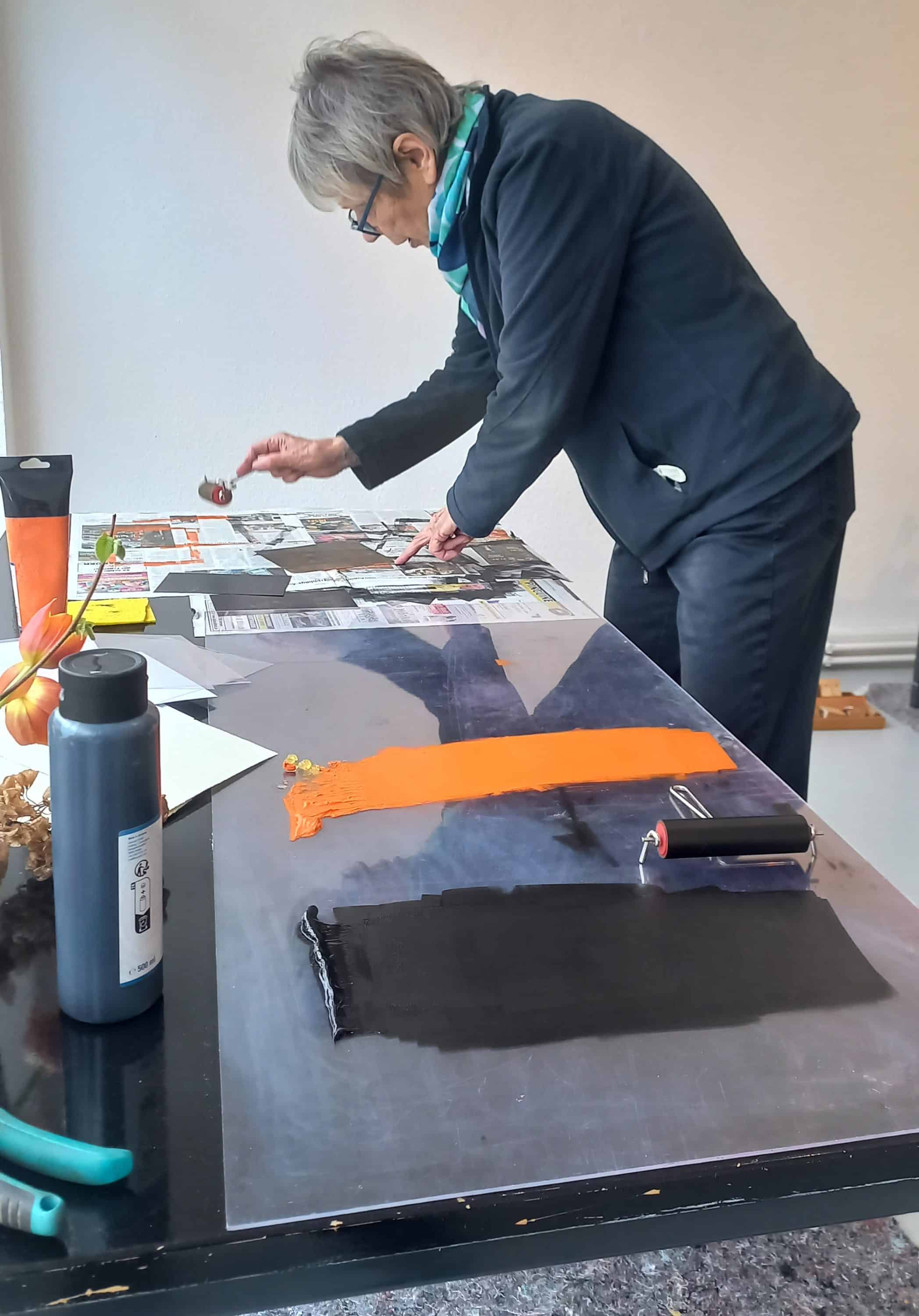 Mut, Freude an der Gestaltung und Lust am Experiment waren am Tag der Druckkunst im Krefelder Kunst-Spektrum gefragt. Die beiden GKK-Künstlerinnen Christiane Behr und Barbara Leifeld hatten zum „Workshop Monotypie“ eingeladen – und die kleine Gruppe Interessierter legte mit Begeisterung los.