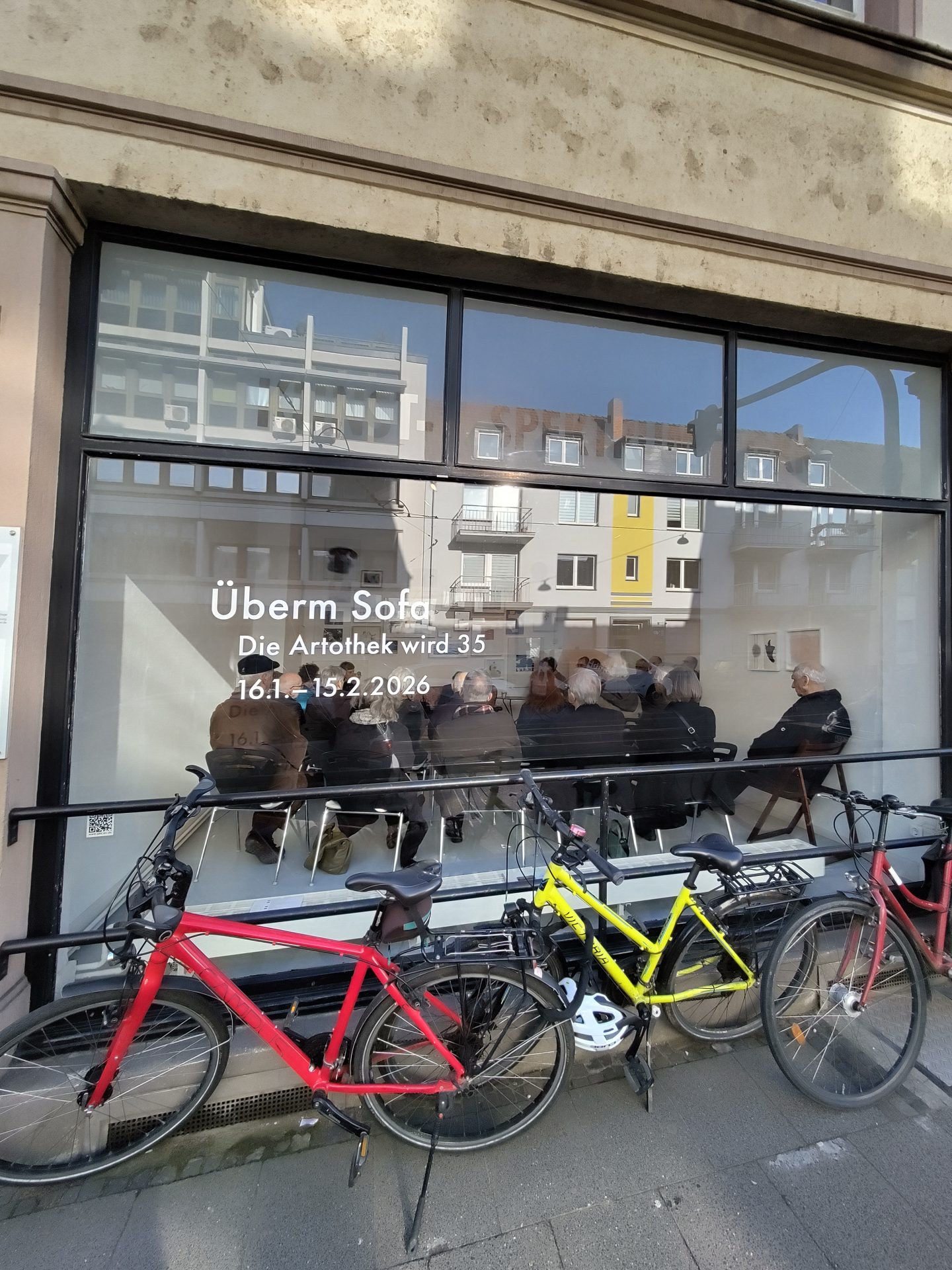 Man kann sich sowohl die Ausstellung in der Parterre und der zweiten Etage ansehen, als auch die Artothek in der mittleren Etage. Brigitta Heidtmann, Leiterin der Artothek, wird dort Fragen rund um die Kunst-Ausleihe beantworten und die große Auswahl an immer wieder aktualisierter zeitgenössischer Kunst präsentieren. Die Arbeiten der KünstlerInnen kann man gleich ausleihen und noch am Abend mitnehmen.